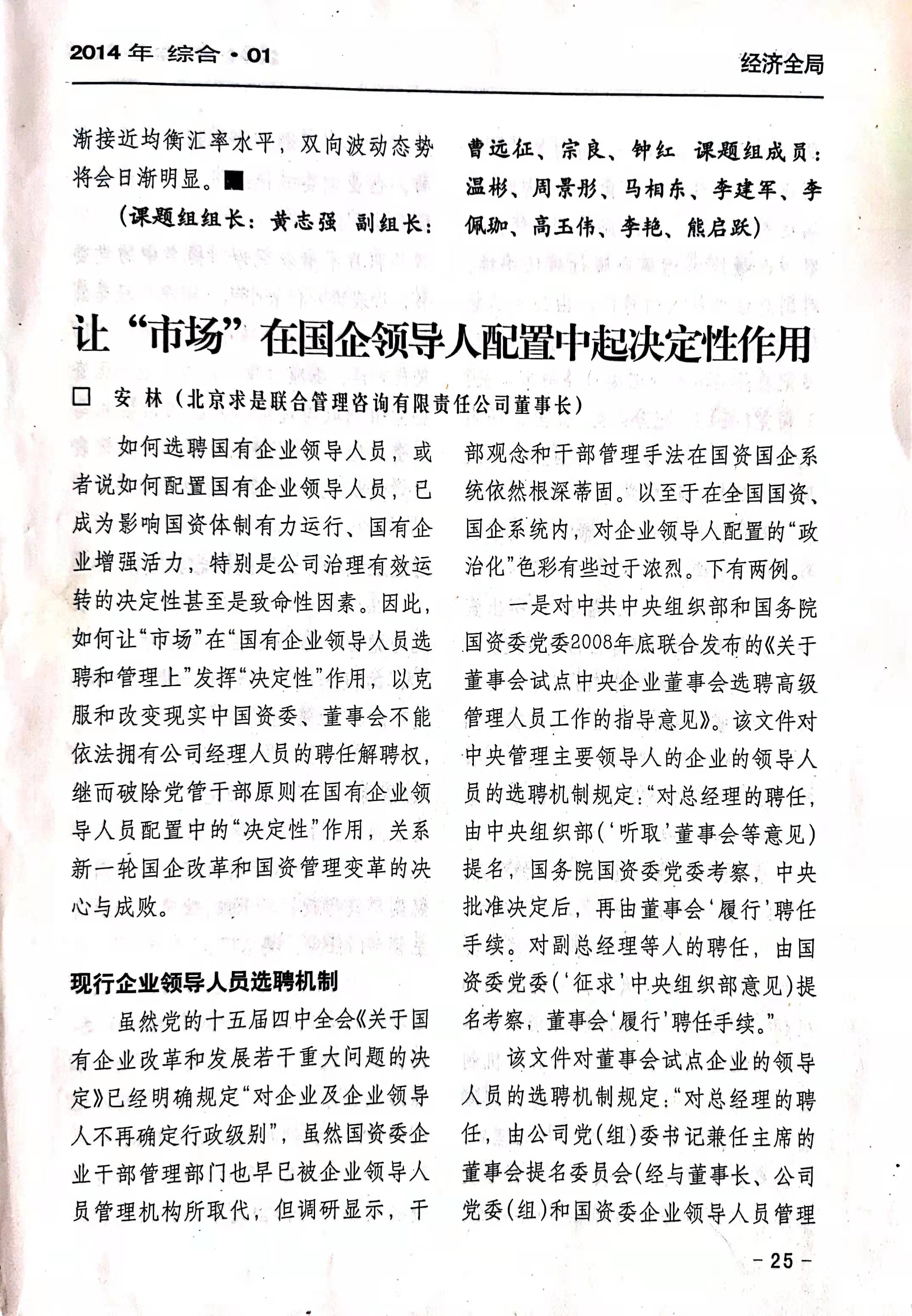 2014年1月,求是咨詢董事長、《改革內(nèi)參》特約研究員安林博士特邀在《改革內(nèi)參》(綜合01/24)發(fā)表了一篇重要文章:《讓“市場”在國企領(lǐng)導(dǎo)人配置中起決定性作用》。文中通過研究大膽提出“讓董事會差額選聘經(jīng)理人”的改革主張。后又通過建言和提案等形式積極向上反映。