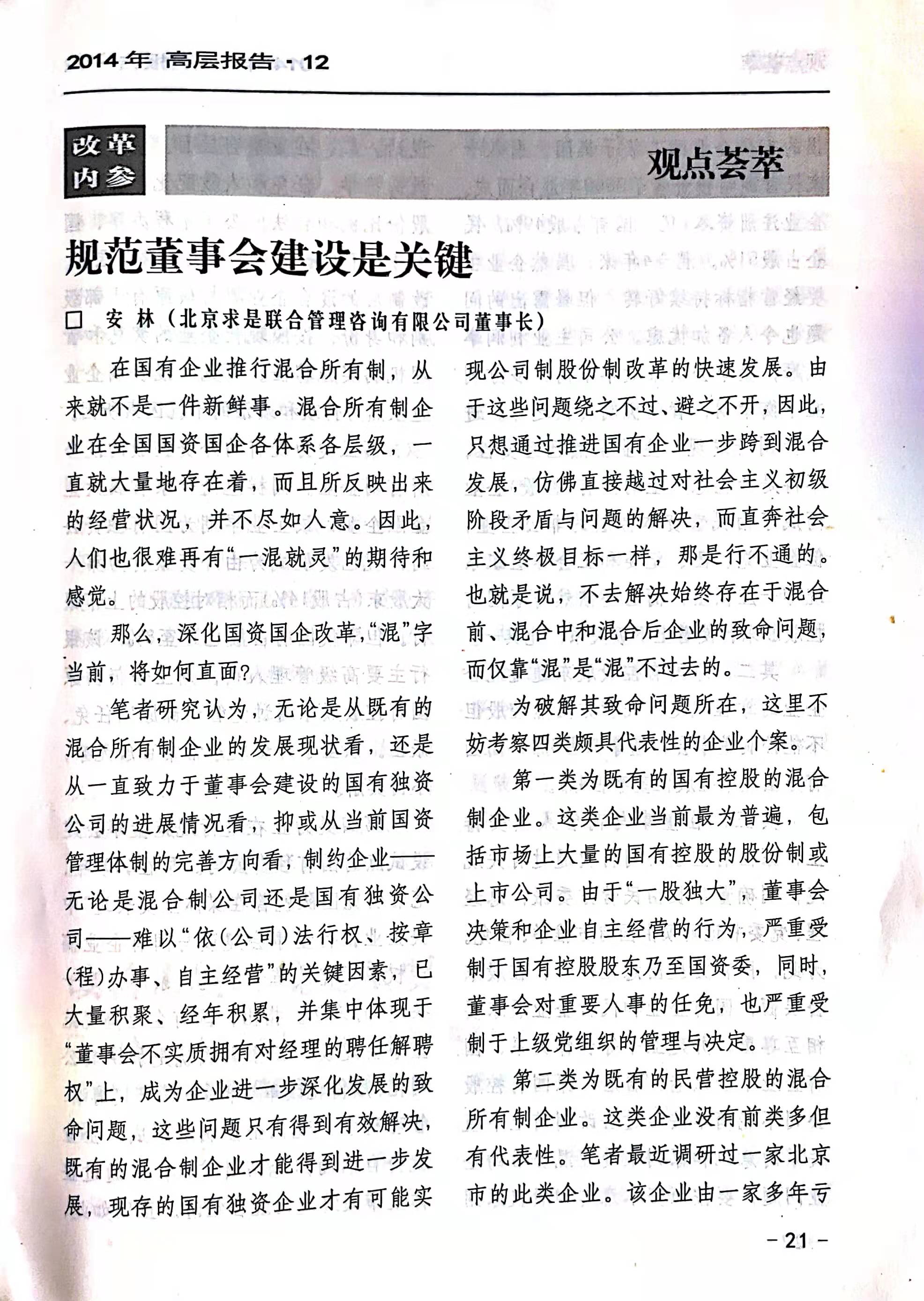 2014年6月,求是咨詢董事長、《改革內(nèi)參》特約研究員安林博士,應(yīng)邀為《改革內(nèi)參》撰寫特約文章:《規(guī)范董事會建設(shè)是關(guān)鍵》。