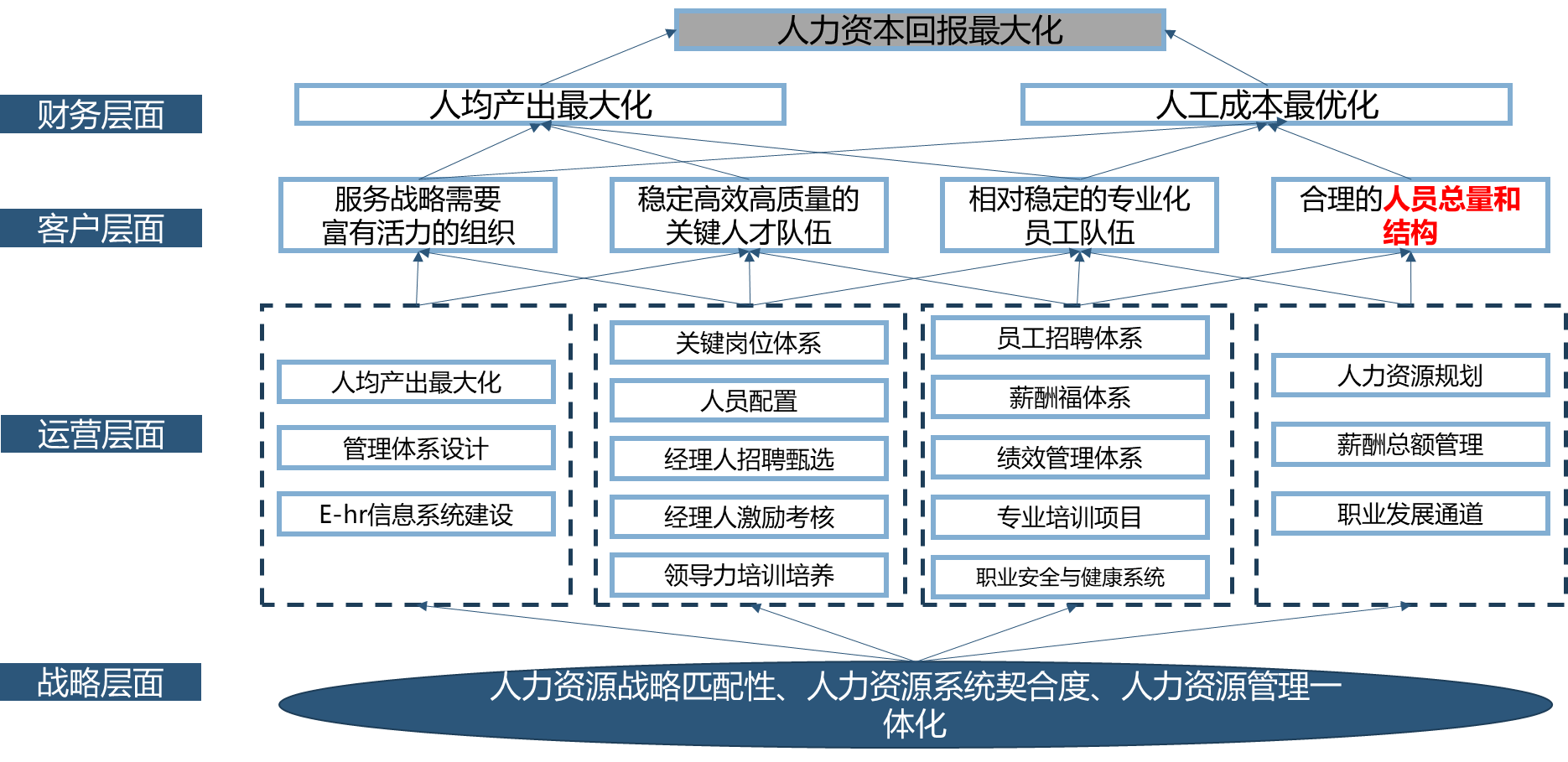 以公司經(jīng)營發(fā)展戰(zhàn)略為先導,遵循提高組織效率的原則,從企業(yè)發(fā)展階段、信息化水平、管理水平、員工能力、技術(shù)水平等實際出發(fā),運用科學的工具方法,按照宏觀微觀分層、崗位類別分類確定編制數(shù)量,達到合理設置崗位和分配人力資源、提高企業(yè)運營效率的目的。