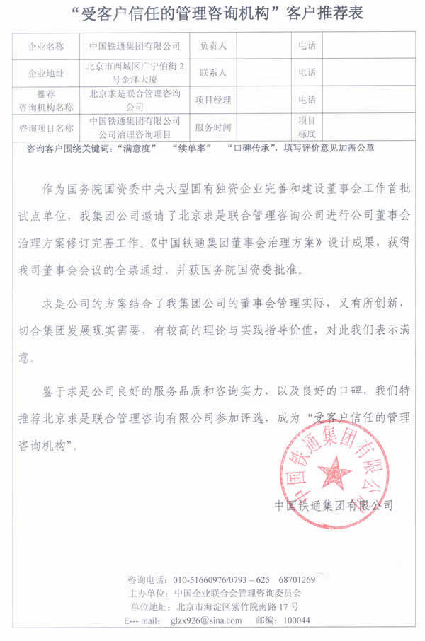 鑒于求是公司良好的服務(wù)品質(zhì)和咨詢實(shí)力,以及良好的口碑,我們特推薦北京求是聯(lián)合管理咨詢有限公司參加評(píng)選,成為“受客戶信任的管理咨詢機(jī)構(gòu),”