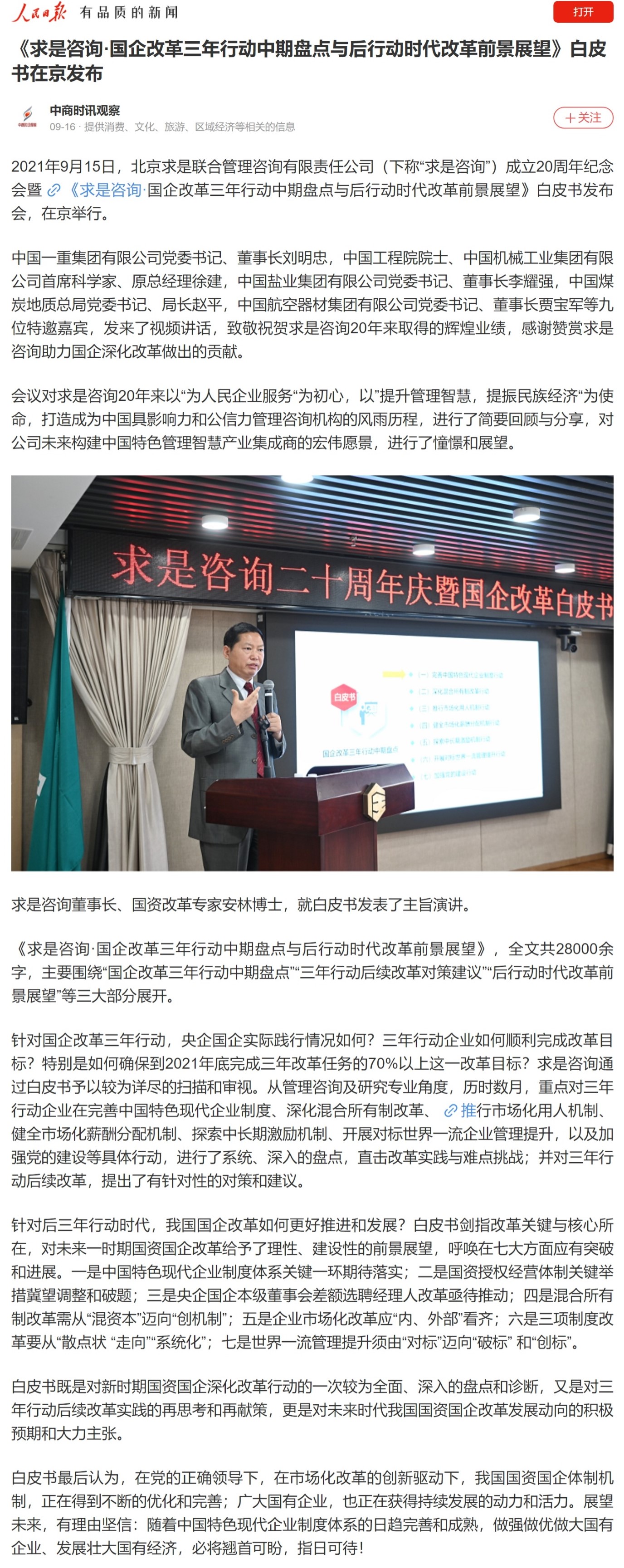 《人民日報》:《求是咨詢·國企改革三年行動中期盤點與后行動時代改革前景展望》白皮書在京發(fā)布