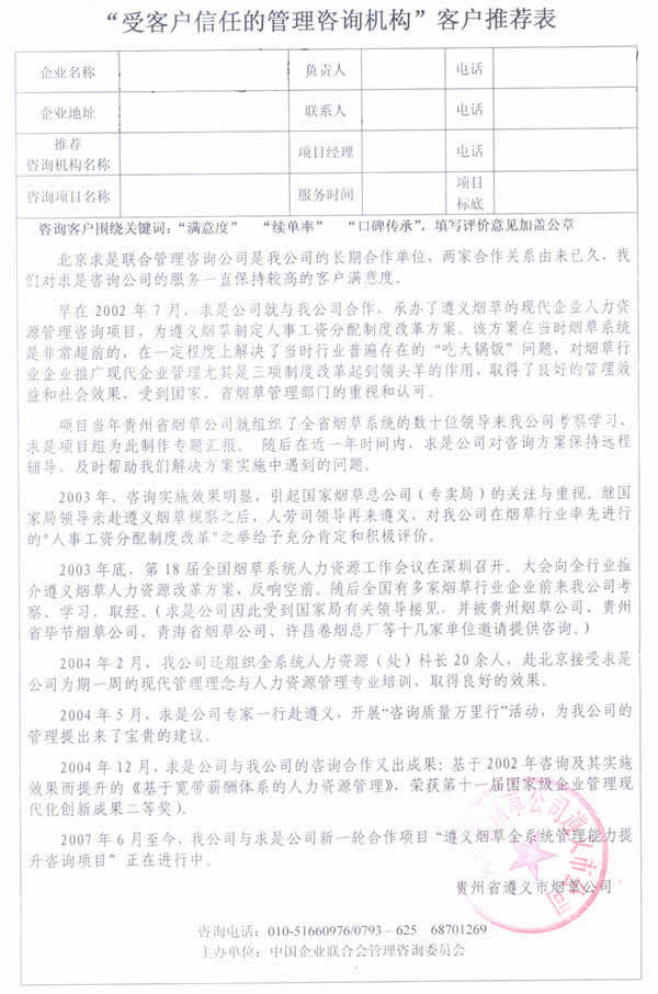 早在2002年7月,求是公司就與我公司合作,承辦了遵義煙草的現(xiàn)代企業(yè)人力資源管理咨詢項(xiàng)目,為遵義煙草制定人事工資分配制度改革方案。該方案在當(dāng)期煙草系統(tǒng)是非常超前的,在一定程度上解決了當(dāng)時(shí)行業(yè)普遍存在的“吃大鍋飯”問題,對(duì)煙草行業(yè)企業(yè)推廣現(xiàn)代企業(yè)管理尤其是三項(xiàng)制度改革起到領(lǐng)頭車的作用,取得了良好的管理效益和社會(huì)效果,受到國家,省煙草管理部門的重視和認(rèn)可。