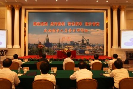 為解放思想,應(yīng)對危機(jī),深化改革,提升管理,武鋼集團(tuán)在湖北咸寧碧桂園鳳凰溫泉酒店,隆重開辦了為期三天的武鋼領(lǐng)導(dǎo)人員學(xué)習(xí)研討班。學(xué)習(xí)班還邀請了軍事經(jīng)濟(jì)學(xué)院院長周來信少將、神化集團(tuán)董事長張喜武、亞琛工業(yè)大學(xué)冶金系主任Bleck教授、中國鋼鐵協(xié)會名譽會長吳溪淳、GE公司中國區(qū)總裁Mark、海爾集團(tuán)董事會主席張瑞敏作精彩的專題講座。