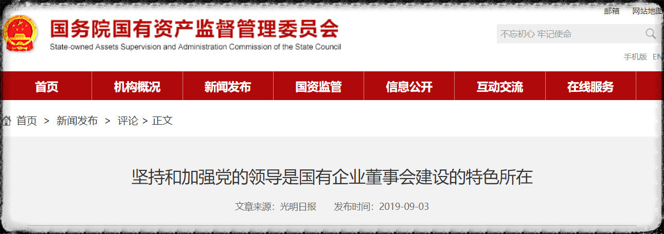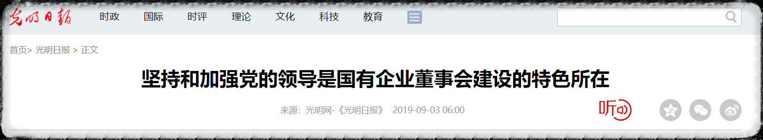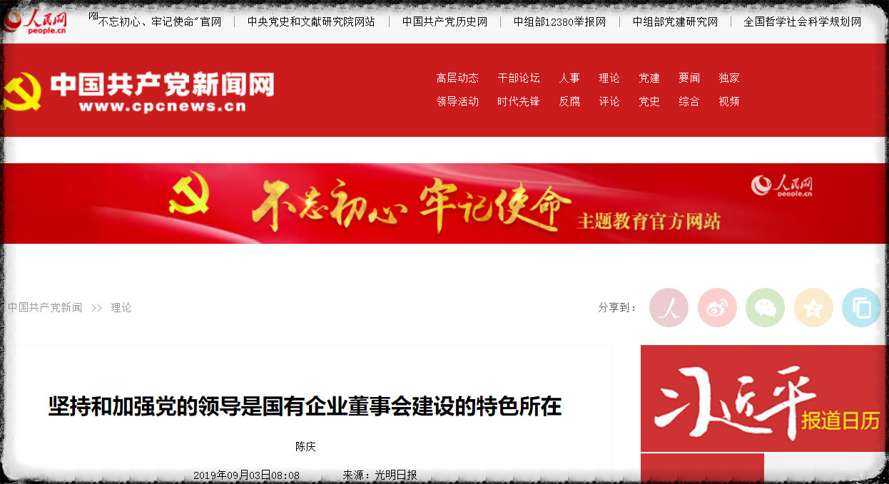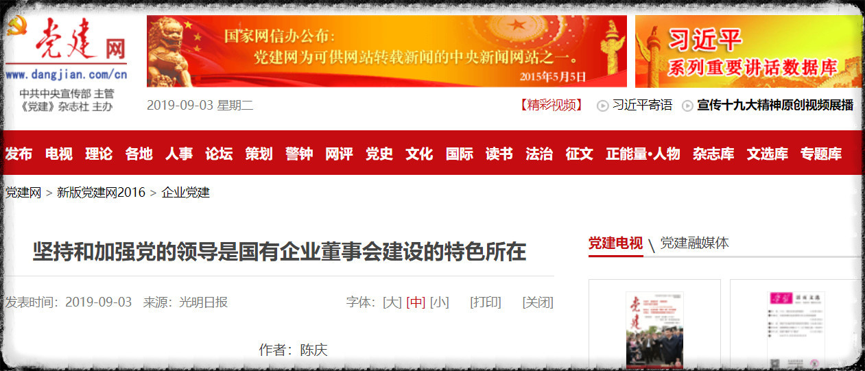 2019年9月3日,《光明日?qǐng)?bào)》經(jīng)濟(jì)學(xué)理論版刊發(fā)了求是咨詢總經(jīng)理、首都經(jīng)濟(jì)貿(mào)易大學(xué)工商管理學(xué)院副教授陳慶博士《堅(jiān)持和加強(qiáng)黨的領(lǐng)導(dǎo)是國有企業(yè)董事會(huì)建設(shè)的特色所在》的署名文章。陳慶博士結(jié)合求是咨詢多年黨建咨詢經(jīng)驗(yàn)和研究成果,清晰梳理了國有企業(yè)董事會(huì)建設(shè)在試點(diǎn)、規(guī)范和完善等不同階段黨組織地位變化的發(fā)展邏輯,創(chuàng)造性地提出:黨組織在公司法人治理中法定地位的確立,實(shí)現(xiàn)了中國特色國有企業(yè)董事會(huì)建設(shè)的理論創(chuàng)新。文章被光明網(wǎng)、人民網(wǎng)、國務(wù)院國有資產(chǎn)管理委員會(huì)、黨建網(wǎng)等多家官媒、網(wǎng)站轉(zhuǎn)載。