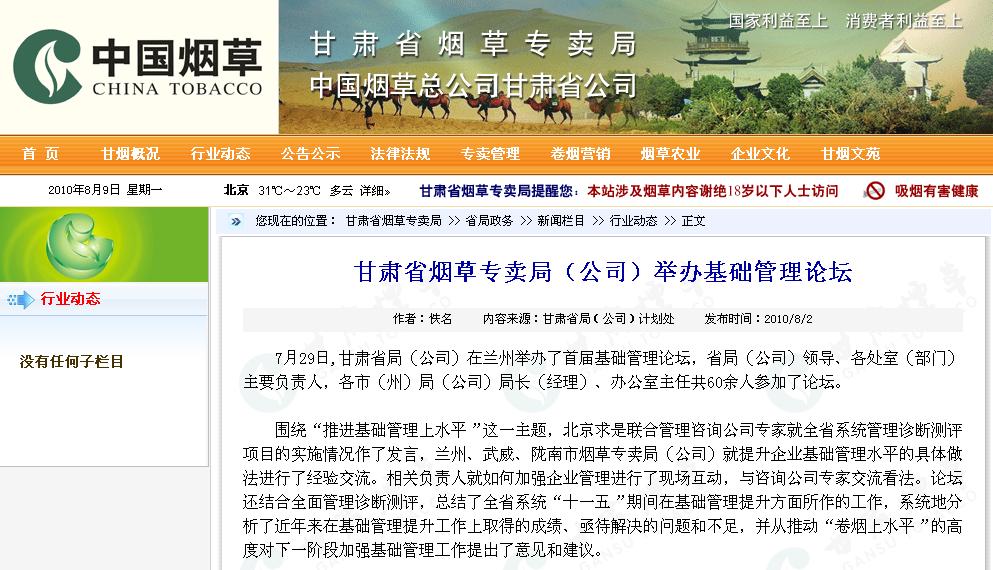 2010年7月29日,首屆甘肅省煙草專賣局基礎(chǔ)管理論壇在蘭州寧臥莊舉行。我司領(lǐng)導(dǎo)應(yīng)邀作全省系統(tǒng)(十四個(gè)地級(jí)市州局)管理診斷評(píng)估報(bào)告,并回答現(xiàn)場各單位領(lǐng)導(dǎo)提問。 報(bào)告獲得省煙草局領(lǐng)導(dǎo)的高度評(píng)價(jià)。