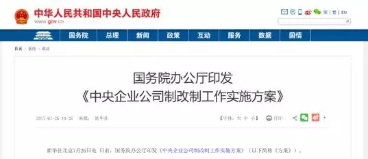《方案》給出了明確時(shí)間表:2017年年底前,除中央金融、文化企業(yè)外,按照全民所有制工業(yè)企業(yè)法登記、國(guó)資委監(jiān)管的中央企業(yè)全部改制為按照公司法登記的有限責(zé)任公司或股份有限公司。