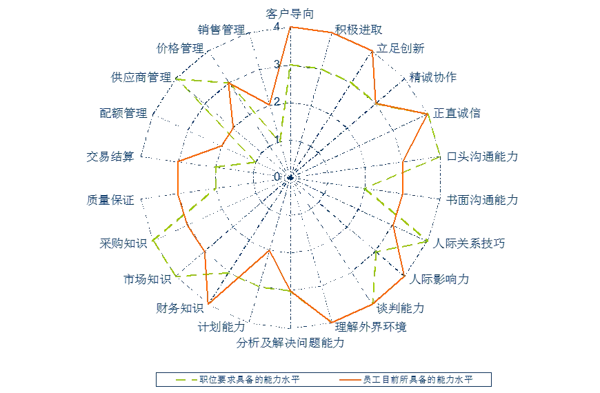 3、專業(yè)能力素質(zhì):履行一個工作崗位或角色所必須具備的產(chǎn)品、服務(wù)、步驟流程及技術(shù)應(yīng)用的知識和技能,其特點(diǎn)主要體現(xiàn)在知識與技能基本能力素質(zhì)的組合,此類能力素質(zhì)較易獲得,但可能僅適用于序列內(nèi)的部分崗位。
