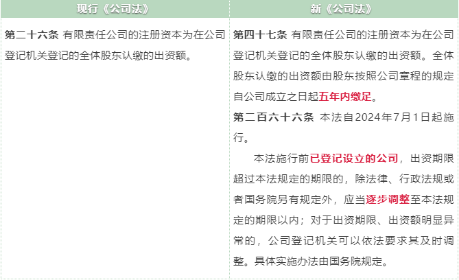 對(duì)于已經(jīng)設(shè)立的公司,新《公司法》設(shè)置了“過(guò)渡期”規(guī)則,第266條規(guī)定:本法施行前已登記設(shè)立的公司,出資期限超過(guò)本法規(guī)定的期限的,除法律、行政法規(guī)或者國(guó)務(wù)院另有規(guī)定外,應(yīng)當(dāng)逐步調(diào)整至本法規(guī)定的期限以?xún)?nèi);對(duì)于出資期限、出資額明顯異常的,公司登記機(jī)關(guān)可以依法要求其及時(shí)調(diào)整。
