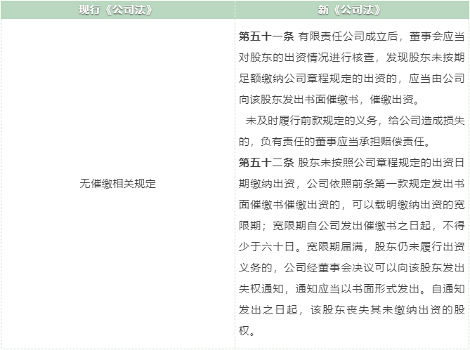 新《公司法》第51條提出董事會(huì)對(duì)股東出資催繳負(fù)有責(zé)任與義務(wù);第52條提出股東未按照公司章程規(guī)定的出資日期繳納出資,寬限期滿可發(fā)失權(quán)通知,股東將因此喪失其未繳納出資的股權(quán)。