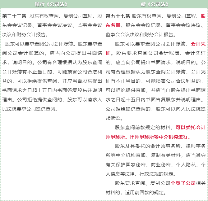 新《公司法》第57條新增了股東有權(quán)查閱和復(fù)制公司的股東名冊(cè),有權(quán)查閱公司會(huì)計(jì)憑證的規(guī)定;明確股東可以委托會(huì)計(jì)師事務(wù)所、律師事務(wù)所等中介機(jī)構(gòu)行使知情權(quán)的規(guī)定;同時(shí)新增了股東對(duì)全資子公司相關(guān)資料的查閱、復(fù)制權(quán)。