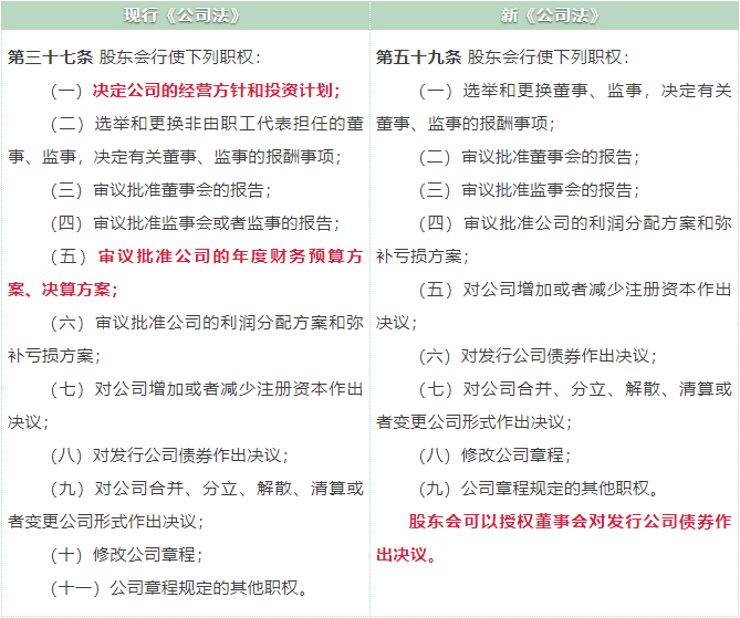 新《公司法》第59條刪除了現(xiàn)行《公司法》中股東會(huì)“決定公司的經(jīng)營(yíng)方針和投資計(jì)劃”、“審議批準(zhǔn)公司的年度財(cái)務(wù)預(yù)算方案、決算方案”兩項(xiàng)職權(quán);增加了“股東會(huì)可以授權(quán)董事會(huì)對(duì)發(fā)行債券作出決議”這項(xiàng)職權(quán)。股東會(huì)的職權(quán)進(jìn)一步精簡(jiǎn),也意味將給予董事會(huì)更大授權(quán)放權(quán)。