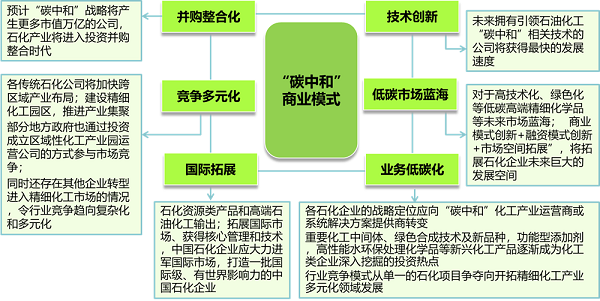 “碳中和”戰(zhàn)略情景下,大中型石化企業(yè)通過并購整合、競爭多元化、國際拓展、業(yè)務(wù)綜合、技術(shù)創(chuàng)新等模式,向“碳中和”石化工產(chǎn)業(yè)運(yùn)營商轉(zhuǎn)型。