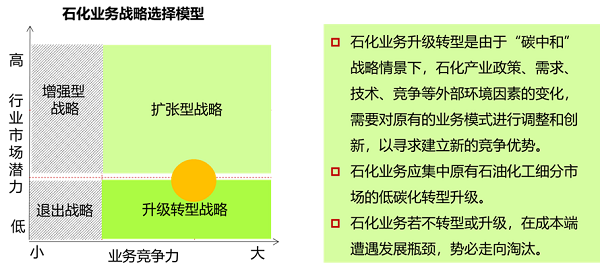 大中型石化企業(yè)的戰(zhàn)略定位、業(yè)務(wù)組合和規(guī)劃目標(biāo)等戰(zhàn)略核心要素將發(fā)生結(jié)構(gòu)性的深刻變化,應(yīng)戰(zhàn)略轉(zhuǎn)移到市場增長潛力較高的低碳業(yè)務(wù)區(qū)域。
