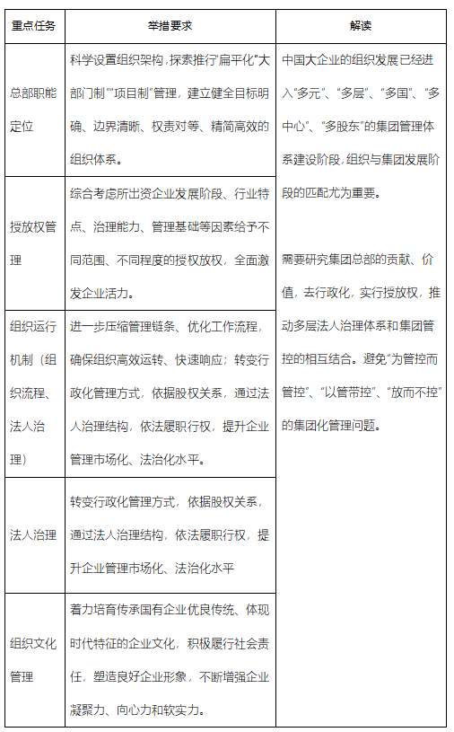 《通知》中將組織管理問題主要界定為總部定位不清晰、機(jī)構(gòu)設(shè)置不匹配、授權(quán)放權(quán)不充分、流程運(yùn)轉(zhuǎn)不順暢、管理方式不合理,提出了總部職能定位、授放權(quán)管理、組織運(yùn)行機(jī)制、法人治理、組織文化管理等五項(xiàng)對標(biāo)任務(wù)。