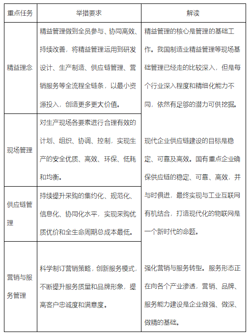 《通知》中將運(yùn)營管理問題主要界定為精細(xì)化管理能力不強(qiáng)、成本和質(zhì)量管控不到位、運(yùn)營效率不高,,提出了精益理念、現(xiàn)場管理、供應(yīng)鏈管理、營銷與服務(wù)管理等四項(xiàng)對標(biāo)任務(wù)。