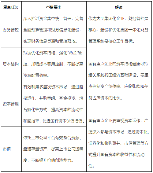 《通知》中將財務(wù)管理問題主要界定為集團(tuán)財務(wù)管控薄弱、“兩金”規(guī)模較大、資金使用效率不高、資本運(yùn)營能力不足,提出了財務(wù)管控、資本結(jié)構(gòu)、資本管理、市值等四項(xiàng)對標(biāo)任務(wù)。