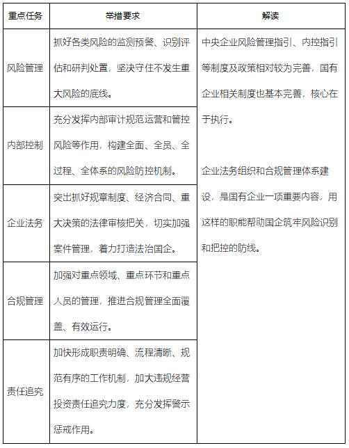 《通知》中將風(fēng)險管理問題主要界定為強(qiáng)化風(fēng)險防控意識、加強(qiáng)內(nèi)控體系建設(shè)、推進(jìn)法律管理與經(jīng)營管理深度融合、健全合規(guī)管理制度、加強(qiáng)責(zé)任追究體系建設(shè),提出了風(fēng)險管理、內(nèi)部管控、企業(yè)法務(wù)、合規(guī)管理、責(zé)任追究等四項(xiàng)對標(biāo)任務(wù)。