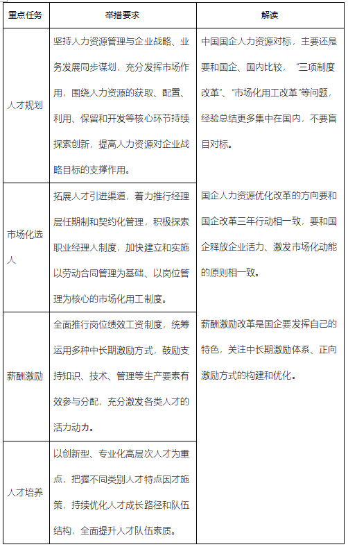 《通知》中將人力資源管理主要問題界定為人力資源規(guī)劃不清晰、三項(xiàng)制度改革落實(shí)不到位、人才隊(duì)伍活力不足、高層次領(lǐng)軍人才缺乏,提出了人才規(guī)則、市場化選人、薪酬激勵、人才培養(yǎng)等四項(xiàng)對標(biāo)任務(wù)。