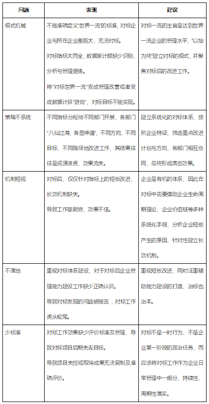 對標(biāo)過程中可能存在的問題是比較多的,總結(jié)求是咨詢既往的經(jīng)驗(yàn),筆者提出如下幾個可能的問題,如模式機(jī)械、策略不系統(tǒng)、機(jī)制短視、不落地、少標(biāo)準(zhǔn),希望各企業(yè)能夠從中有所學(xué)習(xí)借鑒,做好對標(biāo),跨越對標(biāo),成功實(shí)現(xiàn)世界一流管理。