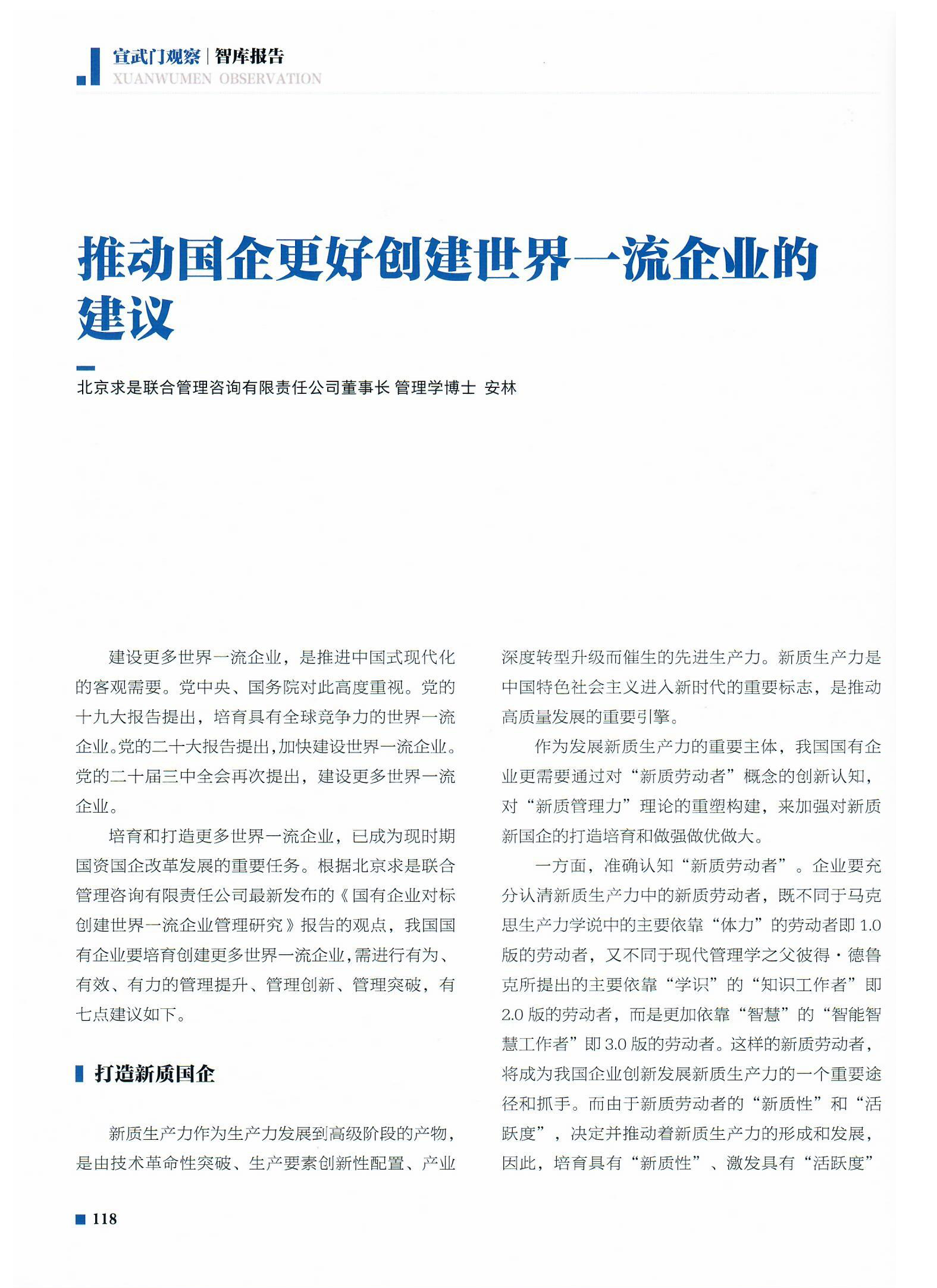 求是咨詢歷時(shí)半年,研究發(fā)布了《國有企業(yè)對(duì)標(biāo)創(chuàng)建世界一流管理研究》報(bào)告,其中關(guān)于《推動(dòng)國企更好創(chuàng)建世界一流企業(yè)的建議》,刊發(fā)于新近出版的國務(wù)院國資委官媒《國資報(bào)告》2024年第10期。