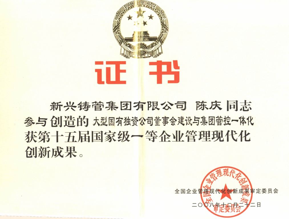 3月28日,2009年中國企業(yè)管理創(chuàng)新大會發(fā)布第十五屆國家級企業(yè)管理現(xiàn)代化創(chuàng)新成果獲獎名單。我公司長期客戶——中央企業(yè)新興鑄管集團(tuán)之《大型國有獨資公司董事會建設(shè)和集團(tuán)管控一體化》榮獲國家級管理創(chuàng)新成果一等獎。