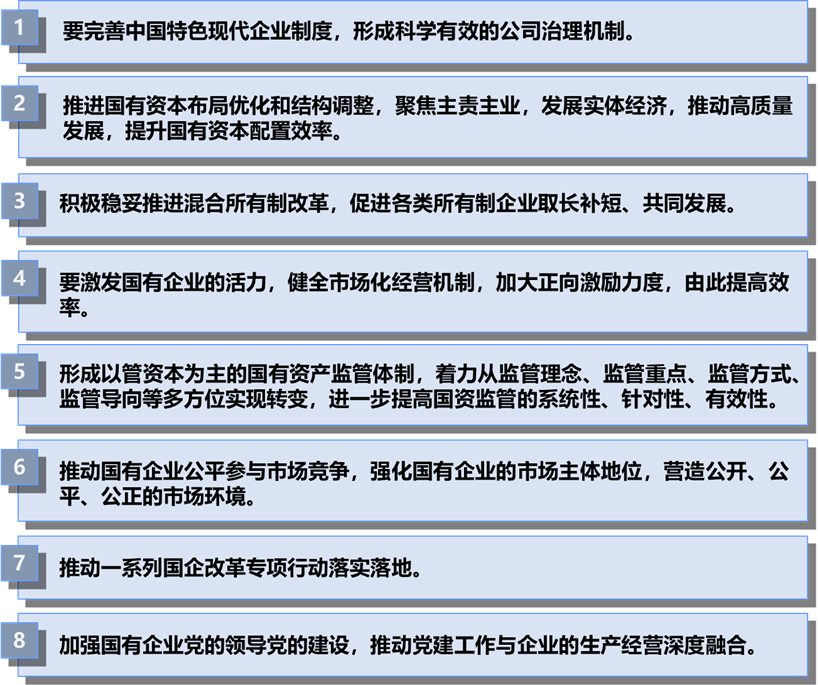 要評(píng)價(jià)國(guó)企改革三年行動(dòng)成效如何,首先要回顧最初制定了哪些重點(diǎn)任務(wù)。2020年6月底,中央全面深化改革委員會(huì)第十四次會(huì)議審議通過(guò)了《國(guó)企改革三年行動(dòng)方案(2020-2022年)》,明確此后3年是國(guó)企改革關(guān)鍵階段。從行動(dòng)方案來(lái)看,國(guó)企改革三年行動(dòng)是落實(shí)改革頂層設(shè)計(jì)的具體“施工圖”,聚焦八個(gè)方面重點(diǎn)任務(wù)。
