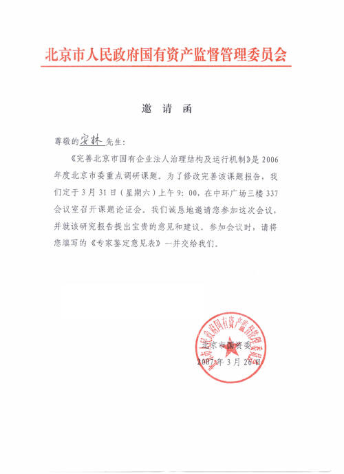 擔(dān)任北京市委重點課題《完善北京市國有企業(yè)法人治理結(jié)構(gòu)及運行機制》 課題評審專家