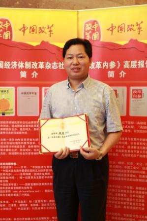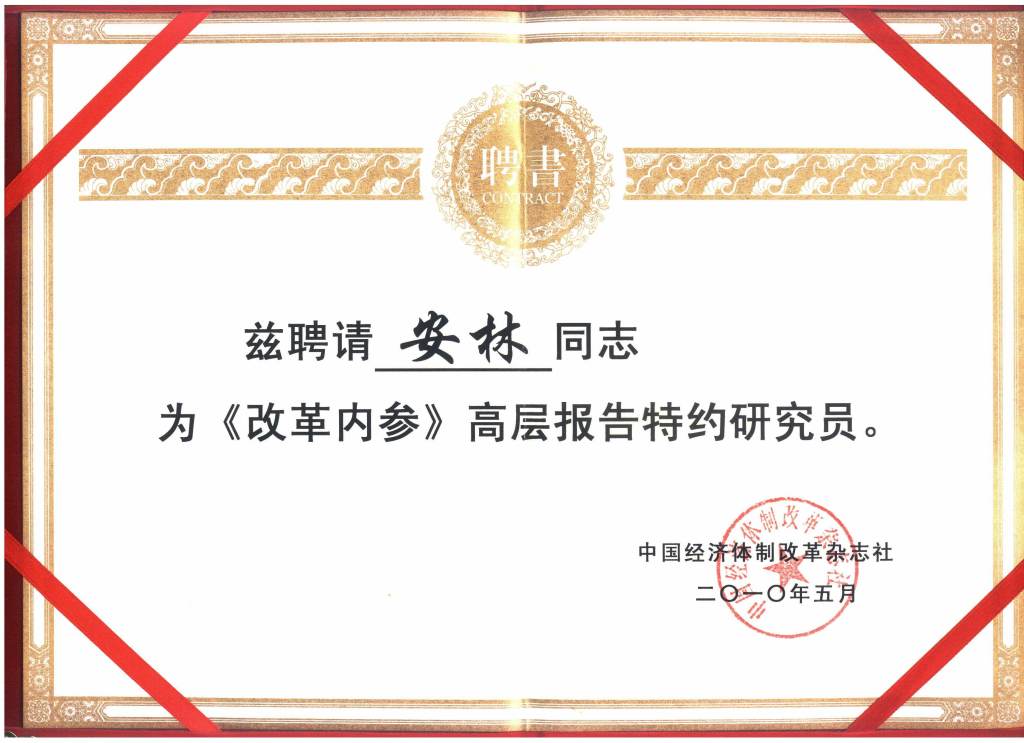 2011年9月4日,由中國(guó)經(jīng)濟(jì)體制改革雜志社、《改革內(nèi)參》高層報(bào)告編輯部主辦的“《改革內(nèi)參》高層報(bào)告特約專(zhuān)家/研究員首屆會(huì)議”,在北京友誼賓館嘉賓樓隆重舉行。我司董事長(zhǎng)安林博士作為中國(guó)國(guó)資與國(guó)企改革咨詢(xún)研究專(zhuān)家,被聘為《改革內(nèi)參》高層報(bào)告特約研究員。