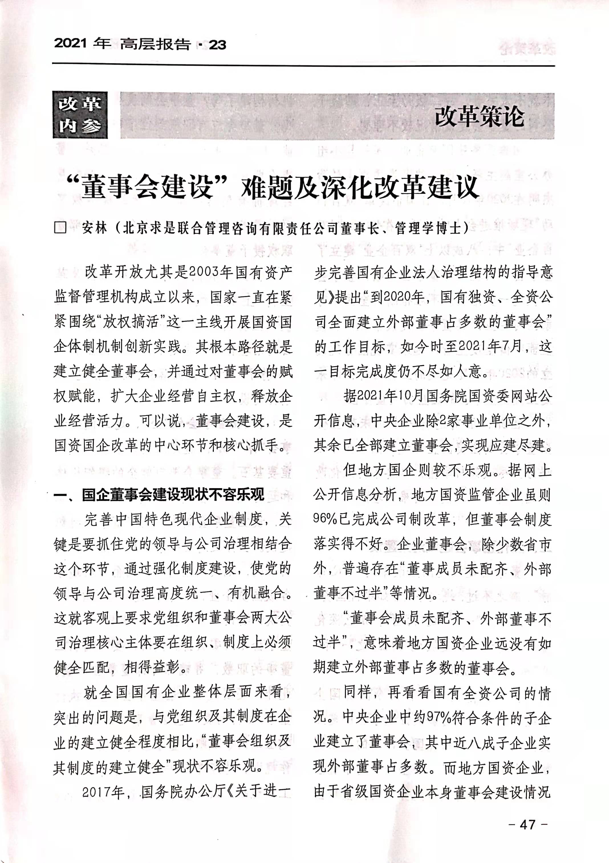 2020年11月,求是咨詢董事長、《改革內(nèi)參》高層報(bào)告特約研究員安林博士,受邀為《改革內(nèi)參》高層報(bào)告撰文:”董事會(huì)建設(shè)“難題及深化改革建議。