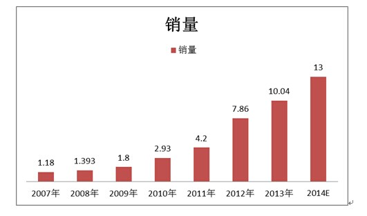 從2007年到2013年全球智能手機(jī)的銷量從1億部上升到2013年的10億部,6年時(shí)間銷量快速增長,2014年智能手機(jī)預(yù)計(jì)銷量13億部。
