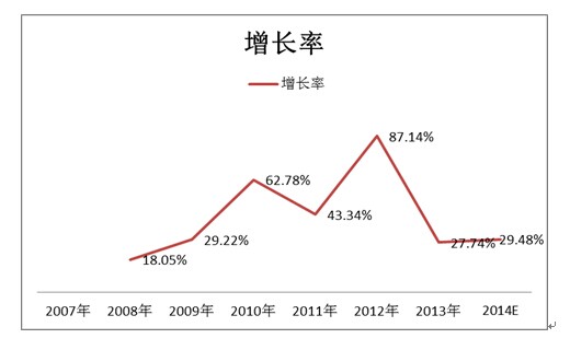 從2008年到2013年全球智能手機(jī)的銷量增長率出現(xiàn)先上升后下降的趨勢(shì),預(yù)計(jì)2014年智能手機(jī)預(yù)計(jì)銷量增長率為29.48%,說明智能機(jī)銷量增長率已經(jīng)放緩,處于成長期末期,預(yù)計(jì)銷量增長持續(xù)放緩。