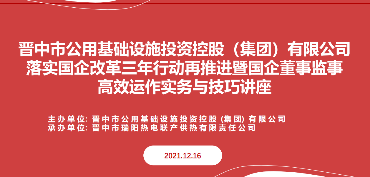 2021年12月16日,求是咨詢總經(jīng)理陳慶博士應(yīng)山西省晉中市公用基礎(chǔ)設(shè)施投資控股(集團(tuán))有限公司(以下簡稱公投集團(tuán))、晉中市瑞陽熱電聯(lián)產(chǎn)供熱有限責(zé)任公司(以下簡稱瑞陽熱電)邀請,為其董監(jiān)高開展專題培訓(xùn)。公投集團(tuán)黨委書記、董事長任靖邦,副董事長、總經(jīng)理郝俊明及其他領(lǐng)導(dǎo)班子成員,瑞陽熱電相關(guān)領(lǐng)導(dǎo)及其下屬企業(yè)的董事、監(jiān)事、高層管理人員等100余人參加了現(xiàn)場培訓(xùn)。