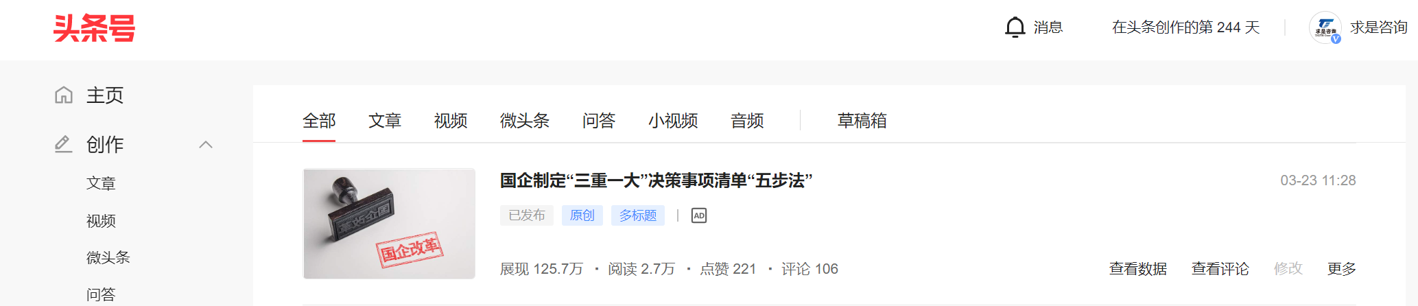 9. 發(fā)表《今日頭條》文章:《國企業(yè)制定“三重一大”決策事項(xiàng)清單“五步法”》,獲得社會(huì)企業(yè)人士好評。