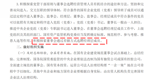 2017年5月3日《國務(wù)院辦公廳關(guān)于進(jìn)一步完善國有企業(yè)法人治理結(jié)構(gòu)的指導(dǎo)意見》(國辦發(fā)〔2017〕36號)正式頒布。文件正式提出:“積極探索董事會(huì)通過差額方式選聘經(jīng)理層成員。”