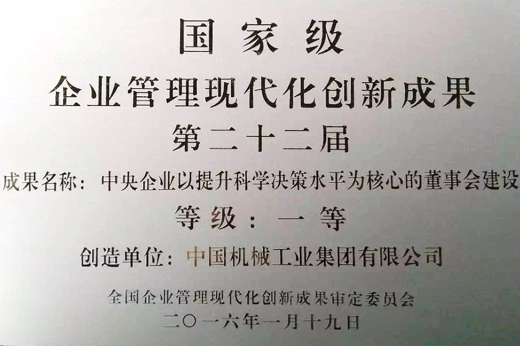 3.中國機(jī)械工業(yè)集團(tuán)公司以董事會(huì)文化為特色的規(guī)范董事會(huì)建設(shè)案例研究(2014年國務(wù)院國資委資助、推廣項(xiàng)目),并以“中央企業(yè)以科學(xué)決策水平為核心的董事會(huì)建設(shè)”獲全國企業(yè)管理現(xiàn)代化創(chuàng)新成果“一等獎(jiǎng)”;