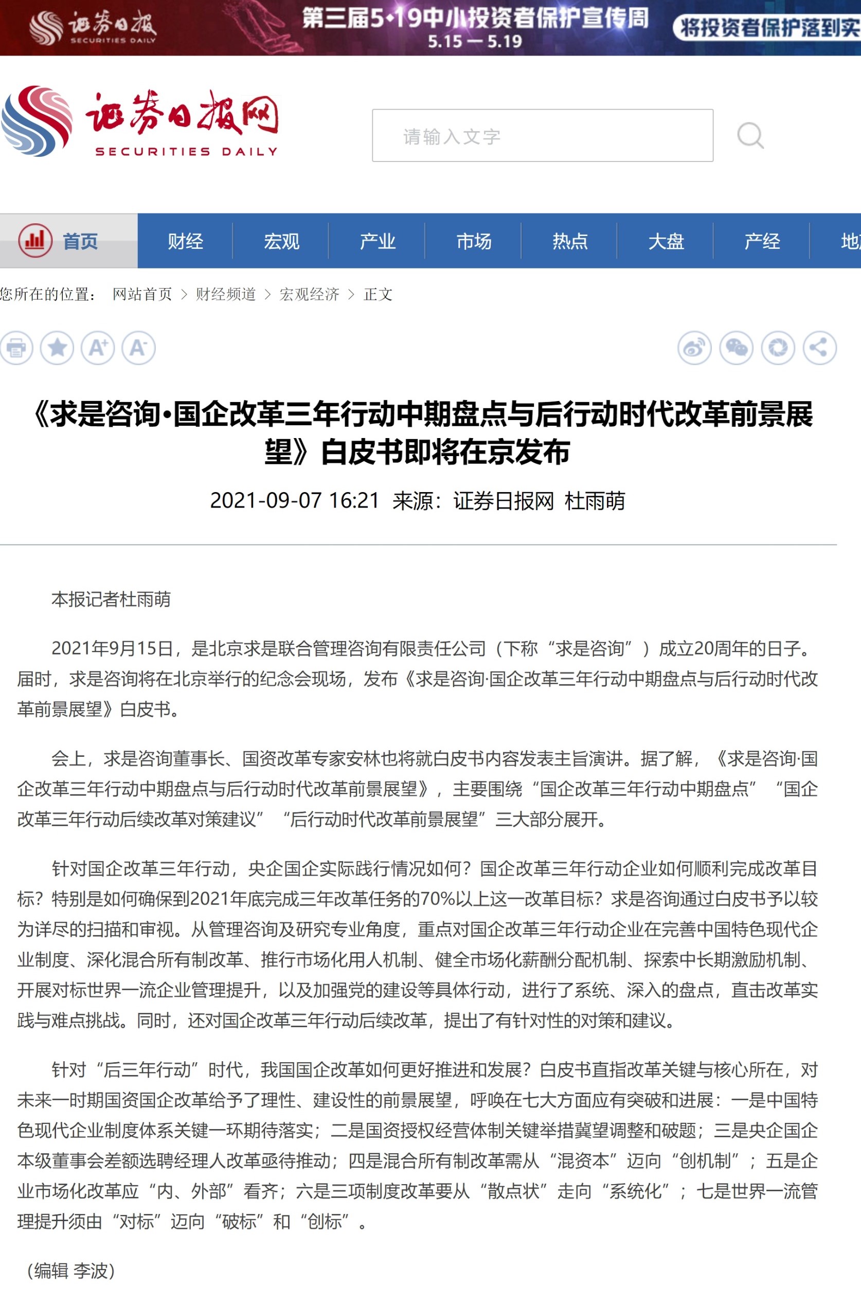 《證券日報(bào)》:《求是咨詢·國企改革三年行動(dòng)中期盤點(diǎn)與后行動(dòng)時(shí)代改革前景展望》白皮書即將在京發(fā)布