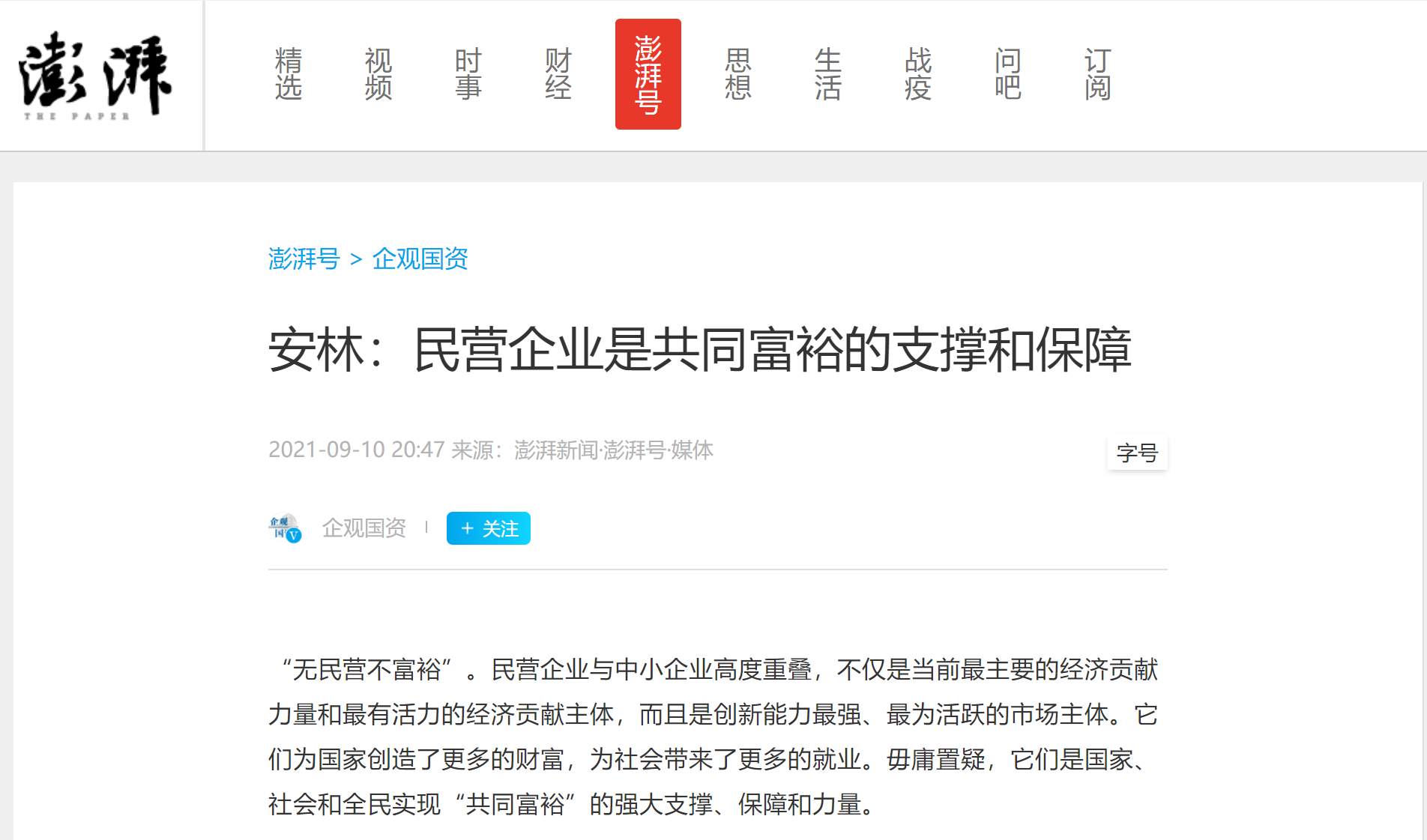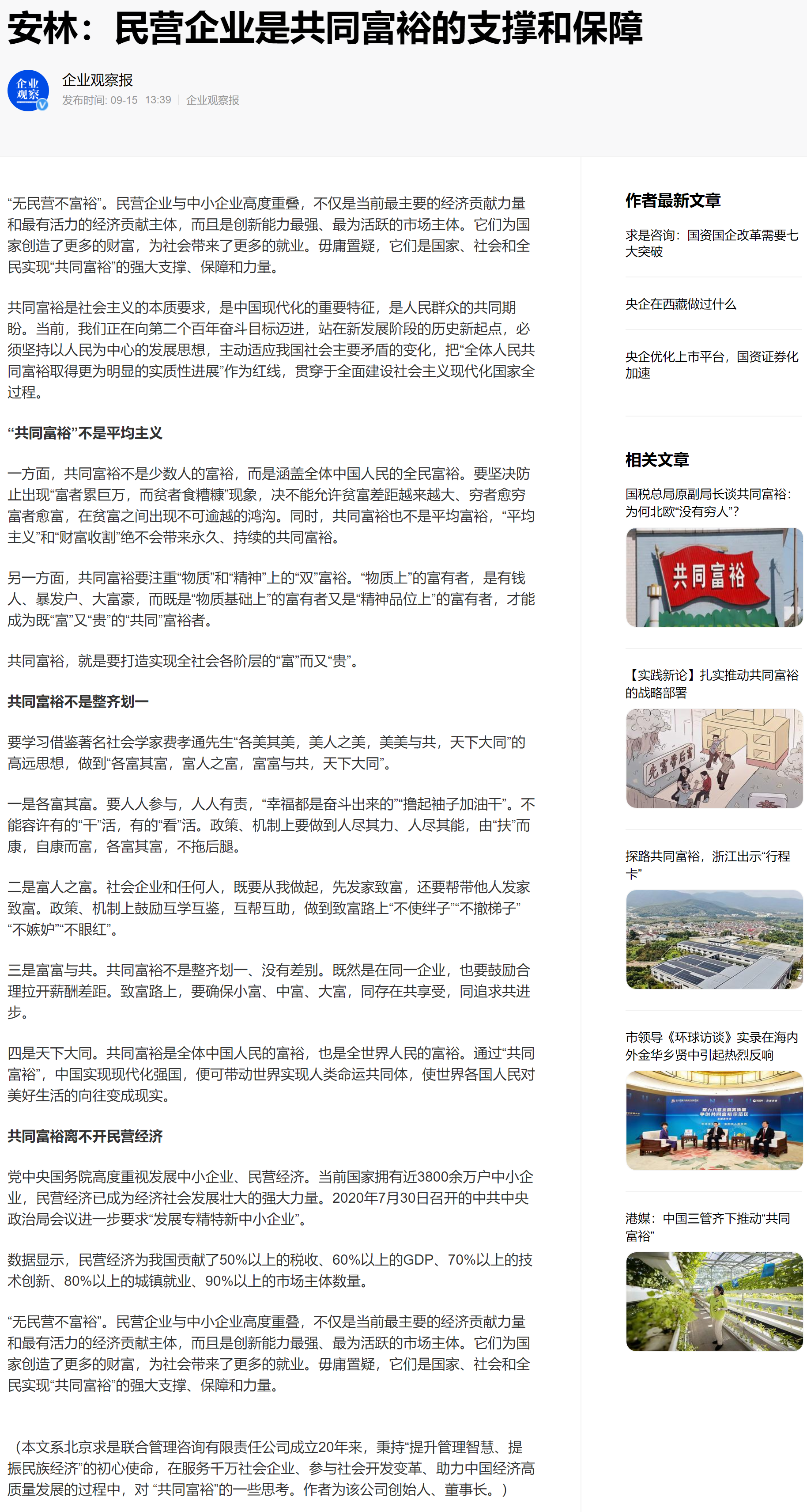 2021年9月10日,《企業(yè)觀察報》官微“企觀國資”發(fā)表求是咨詢董事長安林博士的署名文章《安林:民營企業(yè)是共同富裕的支撐和保障》。這也是北京求是聯(lián)合管理咨詢有限責(zé)任公司成立20年來,秉持“提升管理智慧、提振民族經(jīng)濟(jì)”的初心使命,在服務(wù)千萬社會企業(yè)、參與社會開發(fā)變革、助力中國經(jīng)濟(jì)高質(zhì)量發(fā)展的過程中,對 “共同富裕”的一些思考。