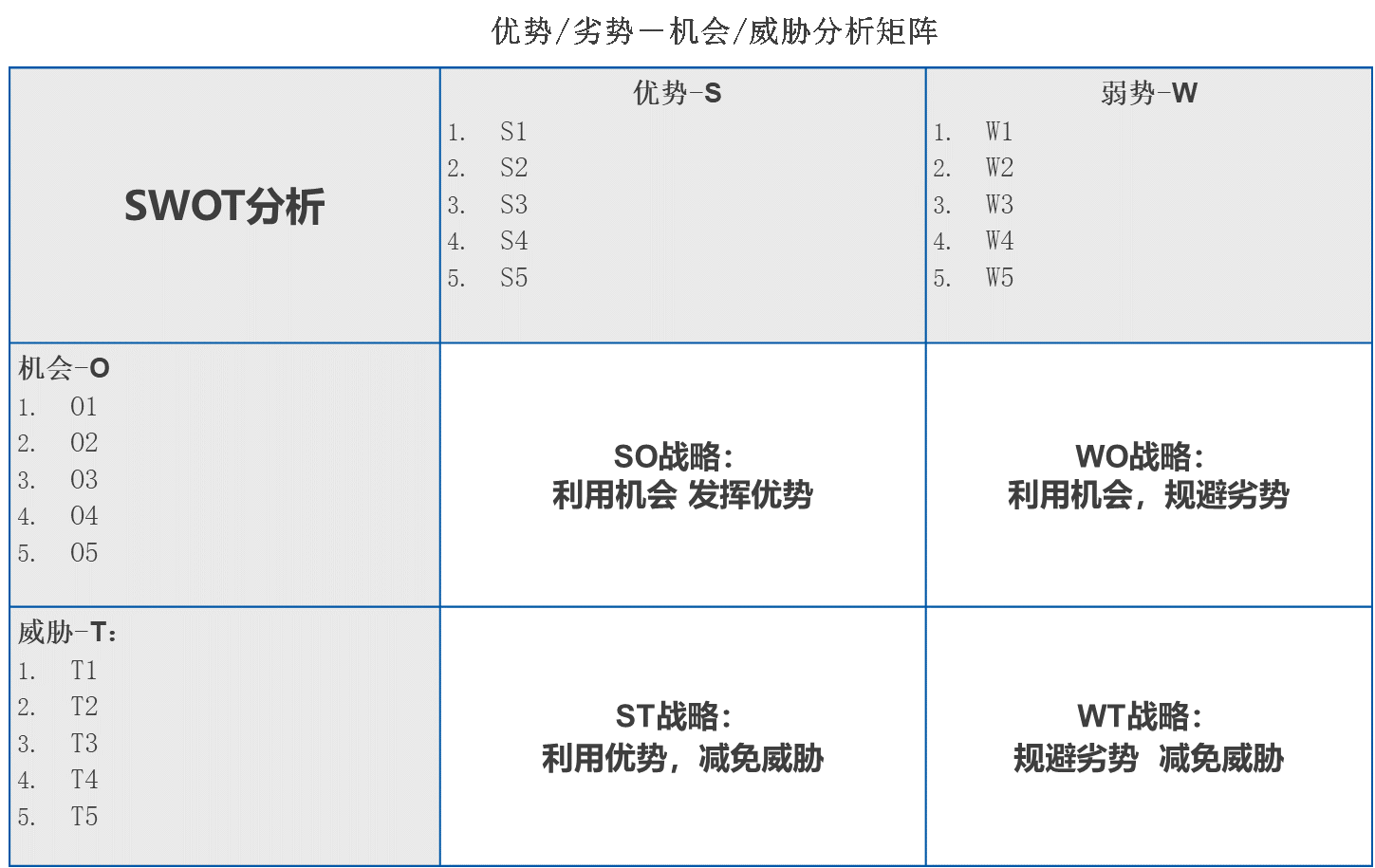 如很多企業(yè)在做戰(zhàn)略規(guī)劃的過程中都會做SWOT分析,雖然看似老套,但也很實用,只要認真思考,最終形成的SO、WO、ST、WT等策略,還是有著一定的指導(dǎo)意義。