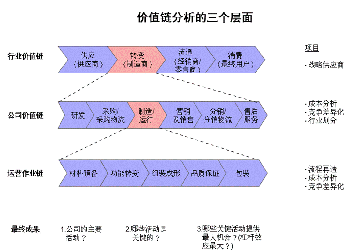 再比如價值鏈分析模型,作為確定企業(yè)競爭優(yōu)勢的分析工具,可以幫助企業(yè)迅速圈定行業(yè)價值鏈、企業(yè)價值鏈、運營作業(yè)鏈的關(guān)鍵環(huán)節(jié)。在行業(yè)分析層面對企業(yè)所處行業(yè)產(chǎn)業(yè)鏈上下游分析,可以作為企業(yè)進行業(yè)務(wù)布局的重要依據(jù);通過企業(yè)價值鏈分析可以幫助企業(yè)發(fā)現(xiàn)競爭優(yōu)勢或短板所在;通過作業(yè)價值鏈分析可以把企業(yè)優(yōu)勢或不足進行分解,將鞏固優(yōu)勢或改善不足細化為具體的措施。