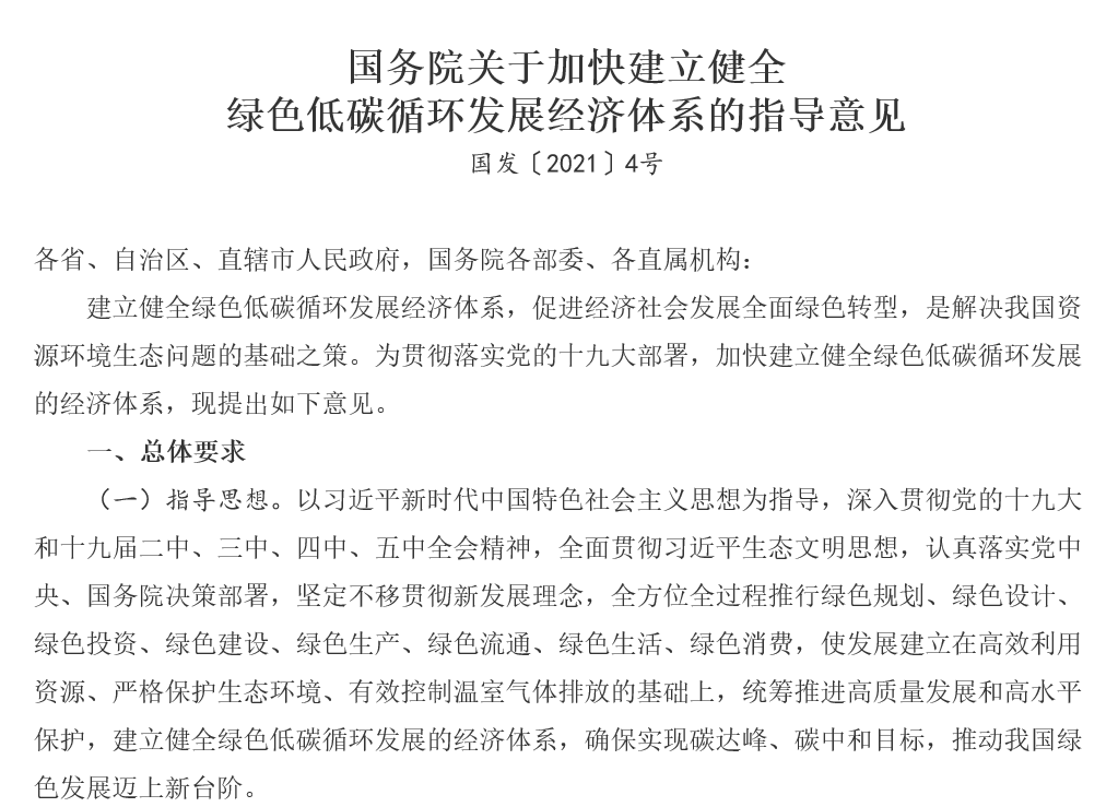 如2021年2月國務(wù)院出臺《關(guān)于加快建立健全綠色低碳循環(huán)發(fā)展經(jīng)濟體系的指導(dǎo)意見》,要求建立綠色低碳循環(huán)發(fā)展的生產(chǎn)體系、流通體系、消費體系,降低碳排放強度,實現(xiàn)碳排放達峰后穩(wěn)中有降。為應(yīng)對氣候變化,我國首次明確提出碳達峰和碳中和,并提出我國力爭2030年碳排放達到峰值,爭取2060年前實現(xiàn)碳中和。