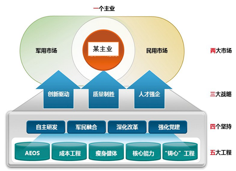 如某央企將總體發(fā)展戰(zhàn)略概括為“12345”戰(zhàn)略:一個主業(yè)、兩大市場(軍用市場、民用市場)、三大戰(zhàn)略(創(chuàng)新驅(qū)動、質(zhì)量制勝、人才強企)、四個堅持(自主研發(fā)、軍民融合、深化改革、強化黨建)、五大工程(AEOS、成本工程、瘦身健體、核心能力、“鑄心”工程)。