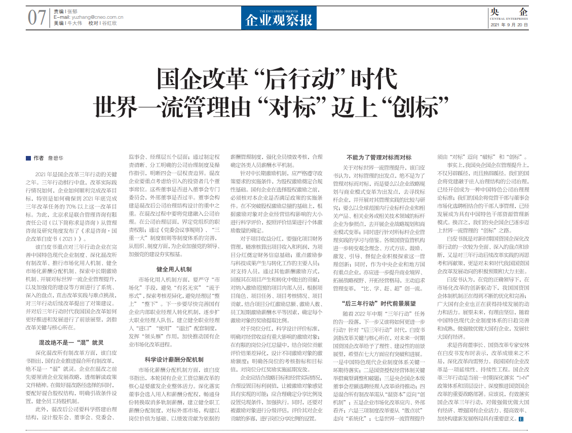 《企業(yè)觀察報(bào)》:國(guó)企改革“后行動(dòng)”時(shí)代 世界一流管理由“對(duì)標(biāo)”邁上“創(chuàng)標(biāo)”