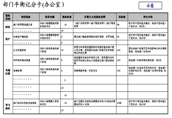 通常情況下,部門指標(biāo)分為共享指標(biāo)、貢獻(xiàn)指標(biāo)和非相關(guān)目標(biāo),其中共享指標(biāo)是由公司平衡計(jì)分卡的關(guān)鍵績(jī)效指標(biāo)直接分解到部門;貢獻(xiàn)指標(biāo)是從內(nèi)部客戶(即其他部門)的主要需求和期望出發(fā)來設(shè)定,對(duì)公司目標(biāo)加以推進(jìn);非相關(guān)目標(biāo)即根據(jù)部門的關(guān)鍵職能設(shè)立的部門目標(biāo)。